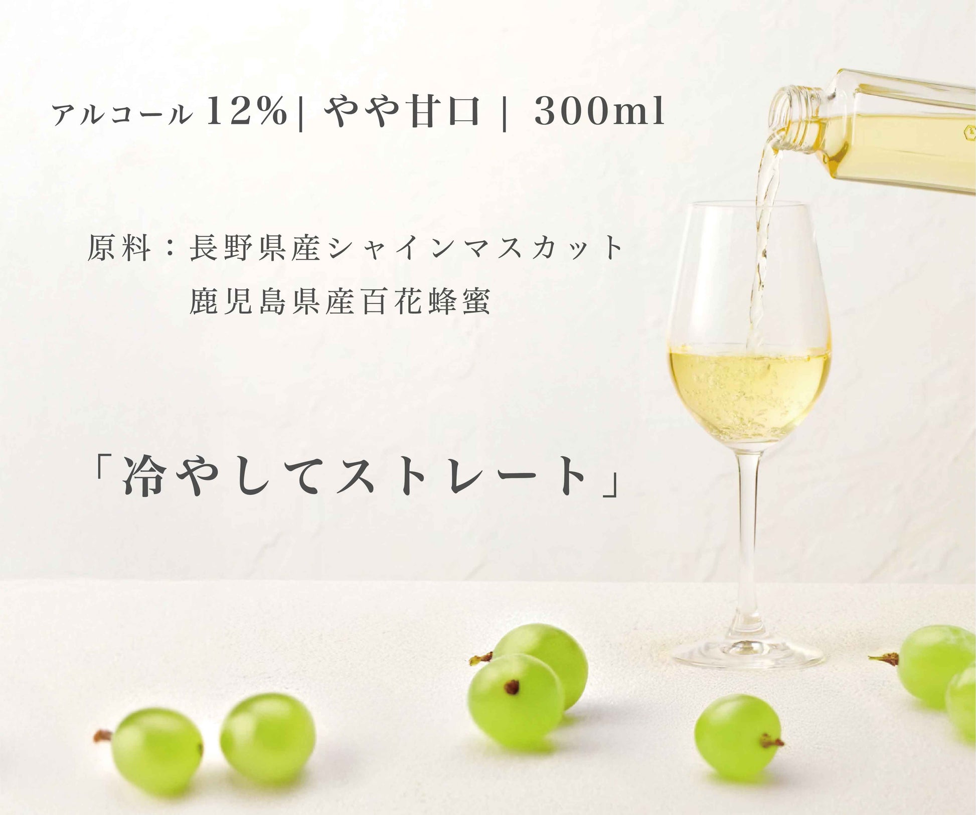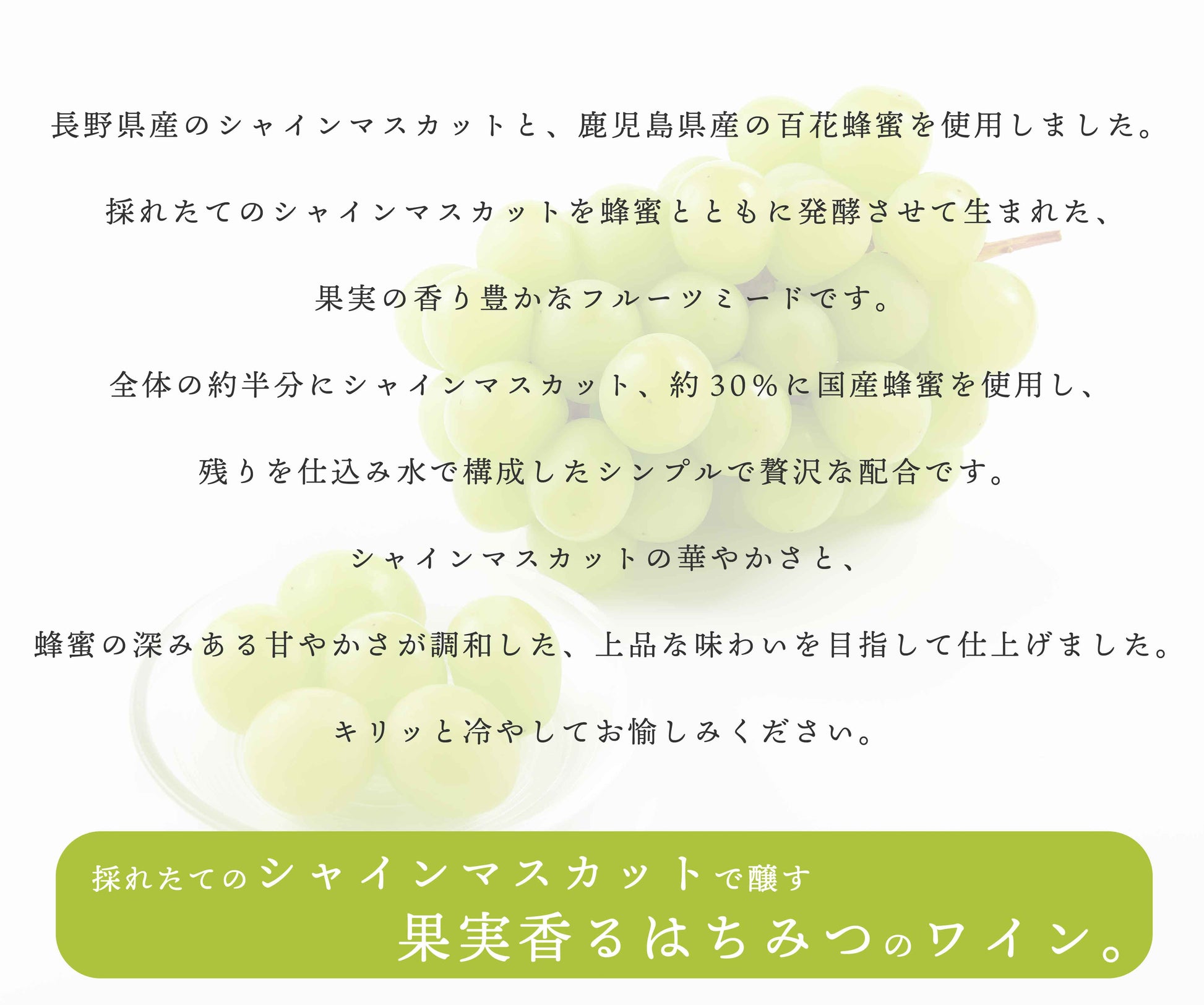 全体の約半分にシャインマスカット、約30%に国産蜂蜜を使用し、残りを仕込み水で構成されたシンプルで贅沢な配合です。